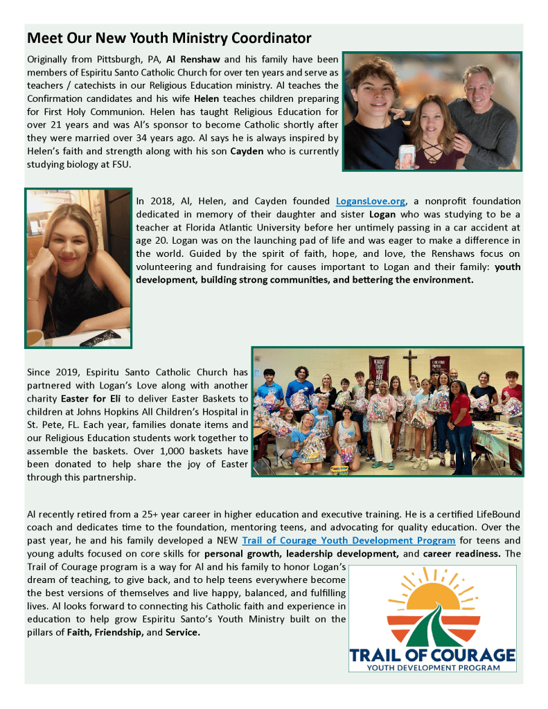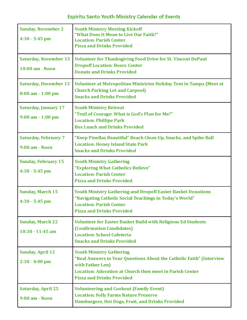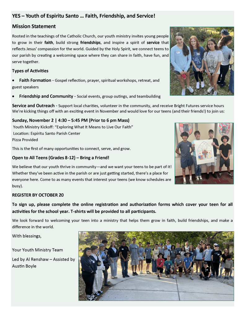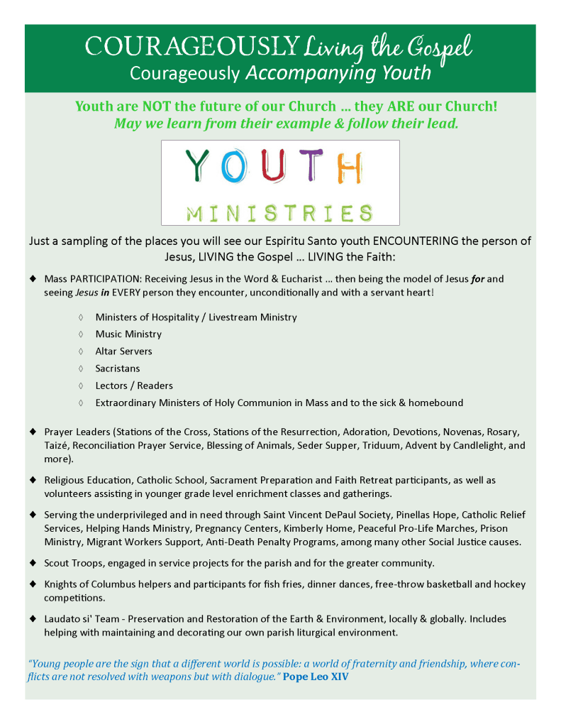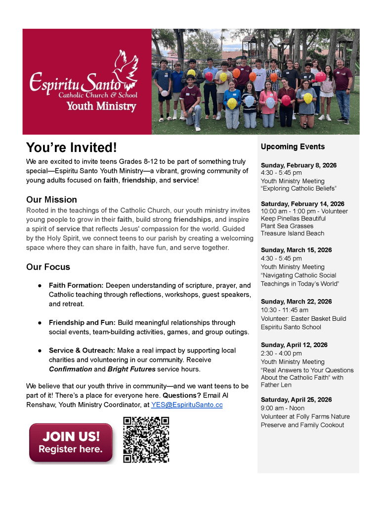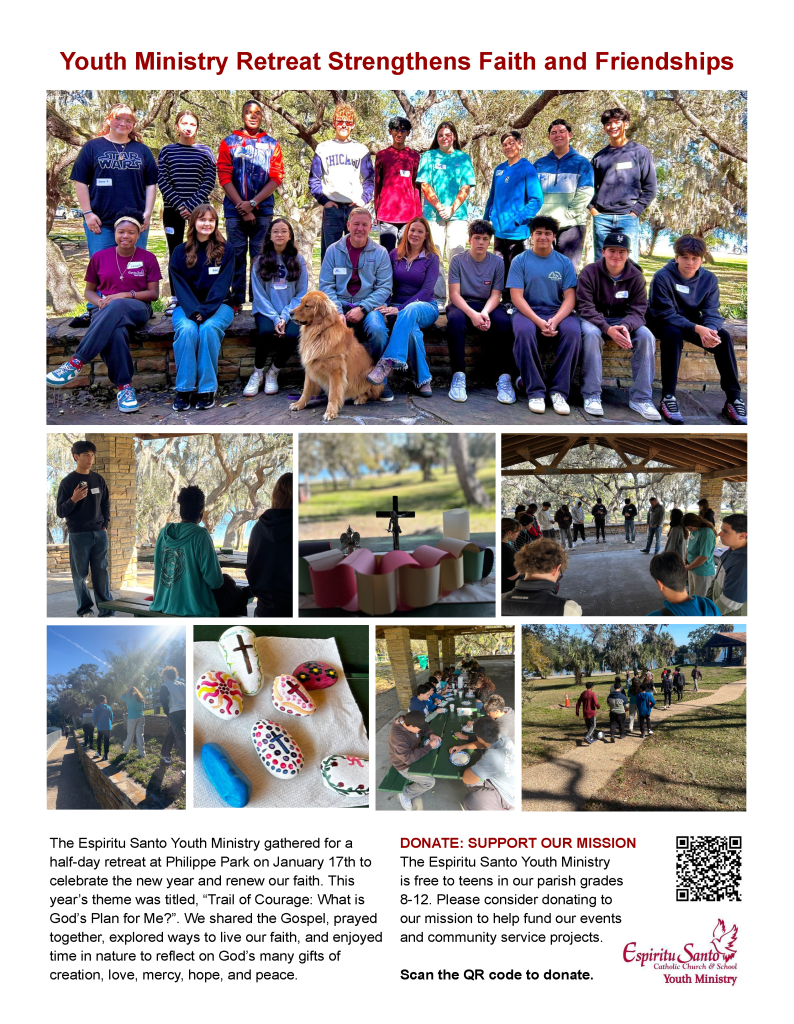 The Youth Ministry of Espiritu Santo Catholic Church is an accepting, welcoming and faith-filled community of young people who seek to grow in their relationship with Jesus Christ and share the joy of the Gospel – by using their gifts in loving service to their family, church, school, community and the world!