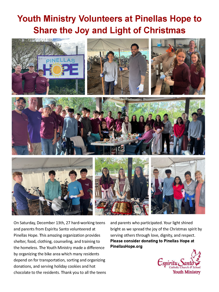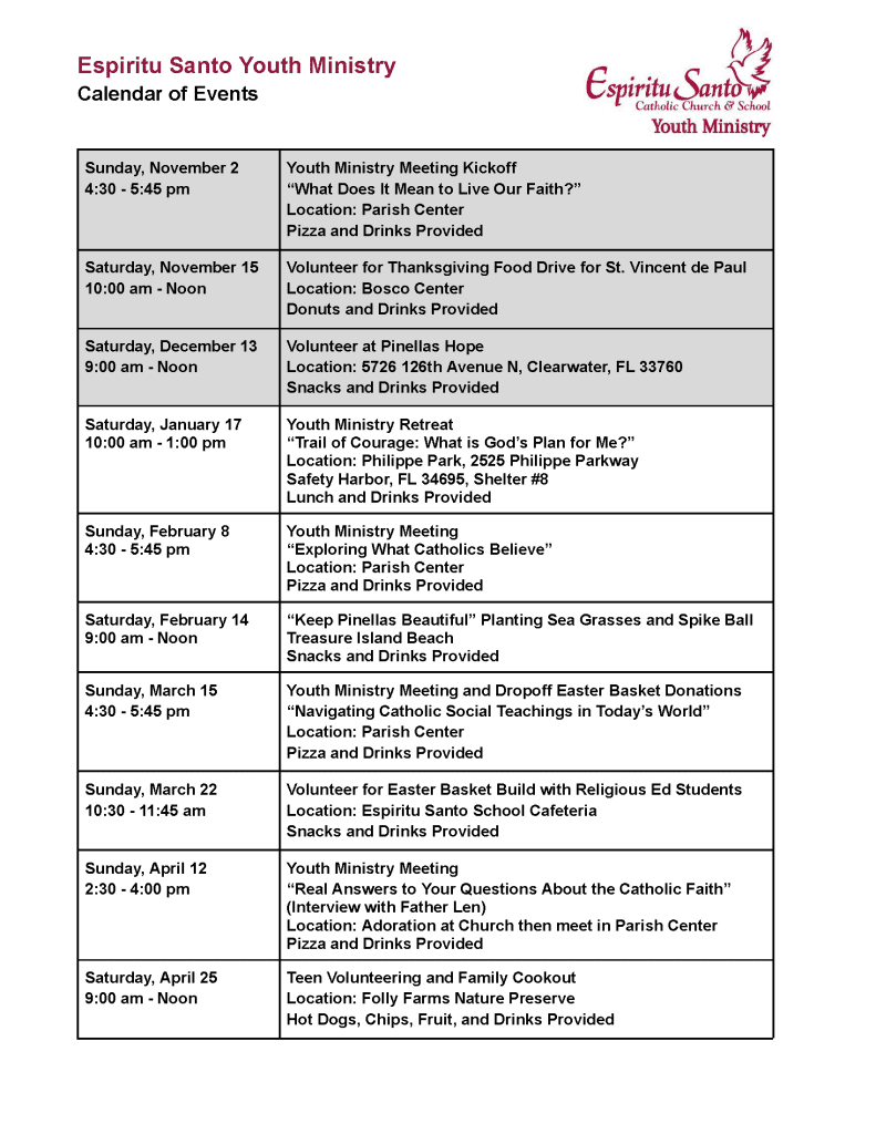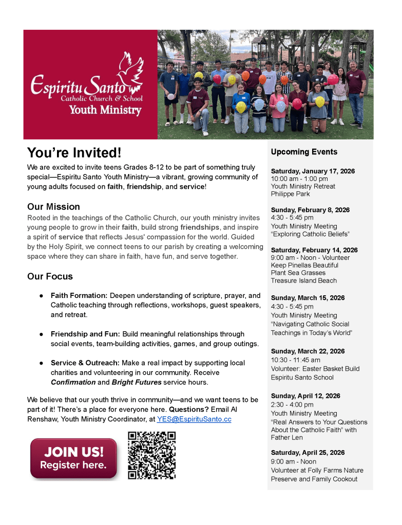 The Youth Ministry of Espiritu Santo Catholic Church is an accepting, welcoming and faith-filled community of young people who seek to grow in their relationship with Jesus Christ and share the joy of the Gospel – by using their gifts in loving service to their family, church, school, community and the world!